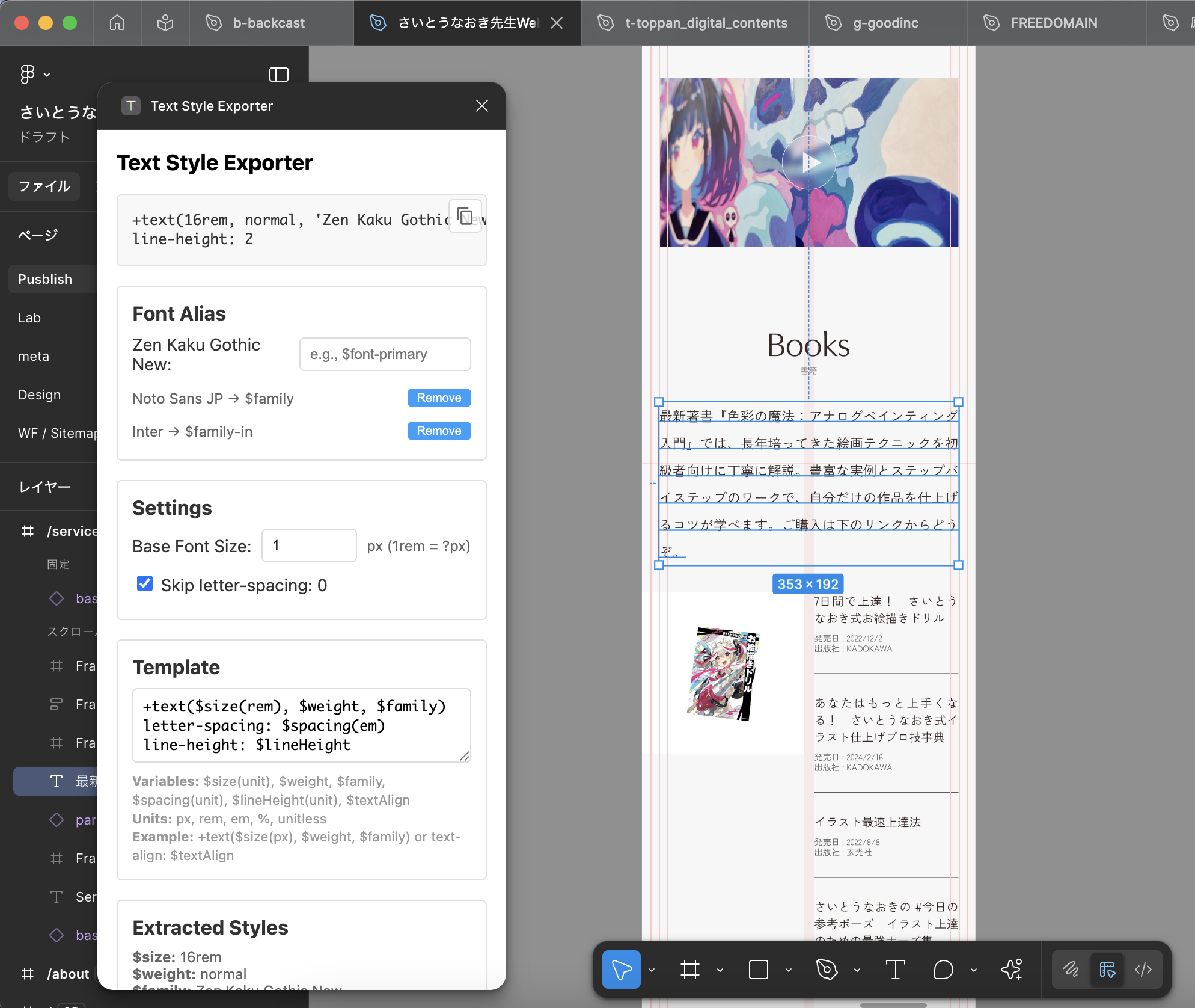 Text Style Exporter 概要 Figmaで選択したテキストのスタイルをSASS/CSS形式で出力するプラグインです。フォントサイズ、ウェイト、ファミ リー、文字間隔、行高、テキスト配置などのプロパティを、カスタマイズ可能なテンプレートに基づいて出力します。 主な機能 🎨 テキストスタイル抽出 - フォントサイズ: px値を自動的にrem値に変換 - フォントウェイト: 数値(100-900)を名前(thin, normal, bold等)に変換 - フォントファミリー: 使用フォント名を抽出 - 文字間隔: パーセント値をem単位に変換 - 行高: 比率として出...