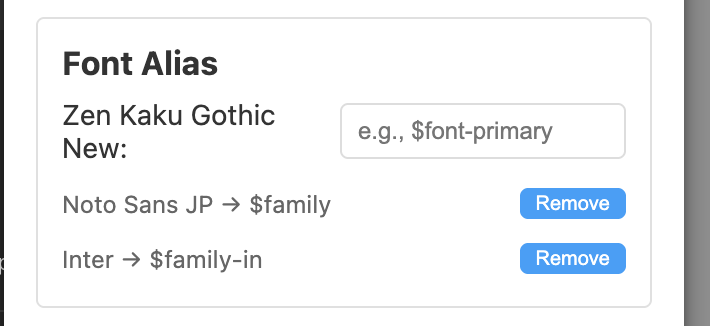 - 変換: エイリアス対応(Inter → $font-primary など)